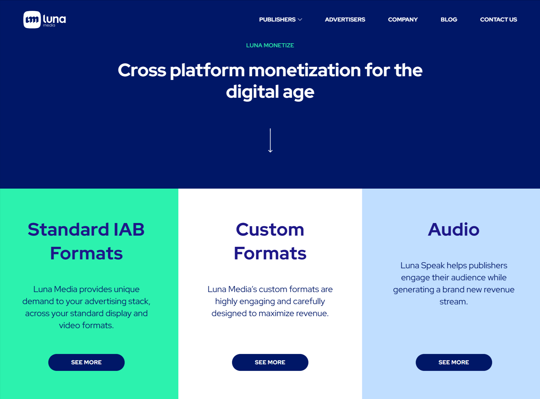 Luna Media supports many different types of sites including publishers of news, blogs, entertainment, or app-based platforms. Their product offerings are flexible and can be customized to meet site-specific needs as well as audience requirements.